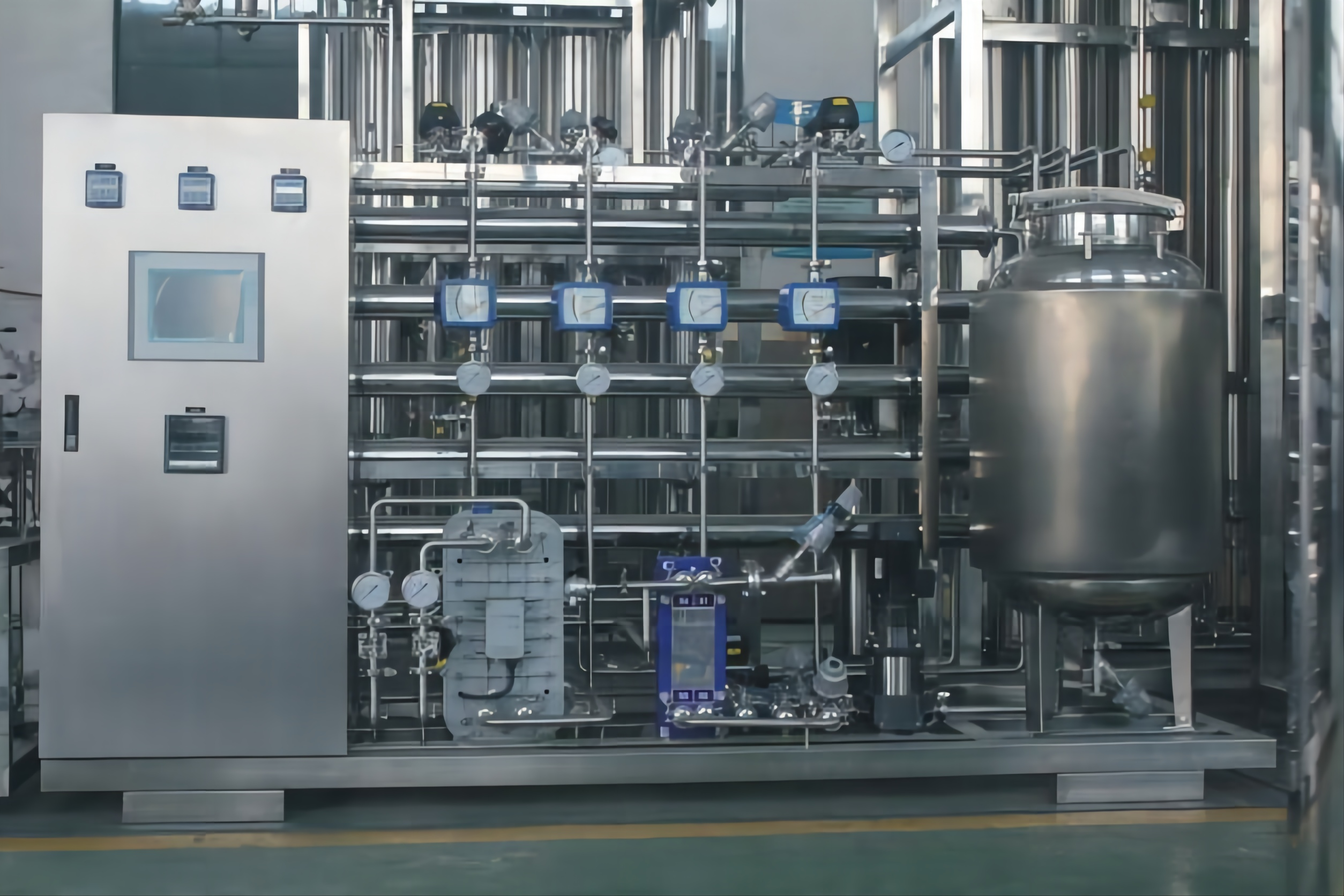 ②工藝:預處理系統(tǒng)→一級高壓泵→一級RO反滲透→級間純水箱→二級高壓泵→二級RO反滲透→二級純水箱→EDI輸送泵→EDI電除鹽系統(tǒng)→無菌純水箱。